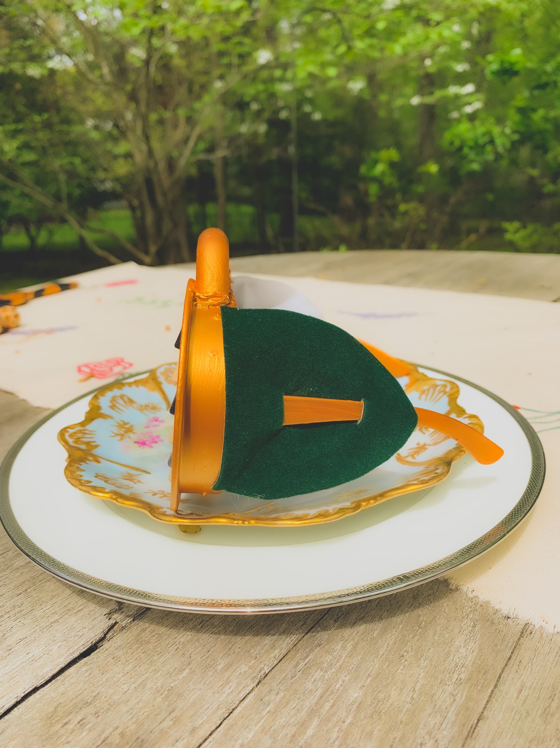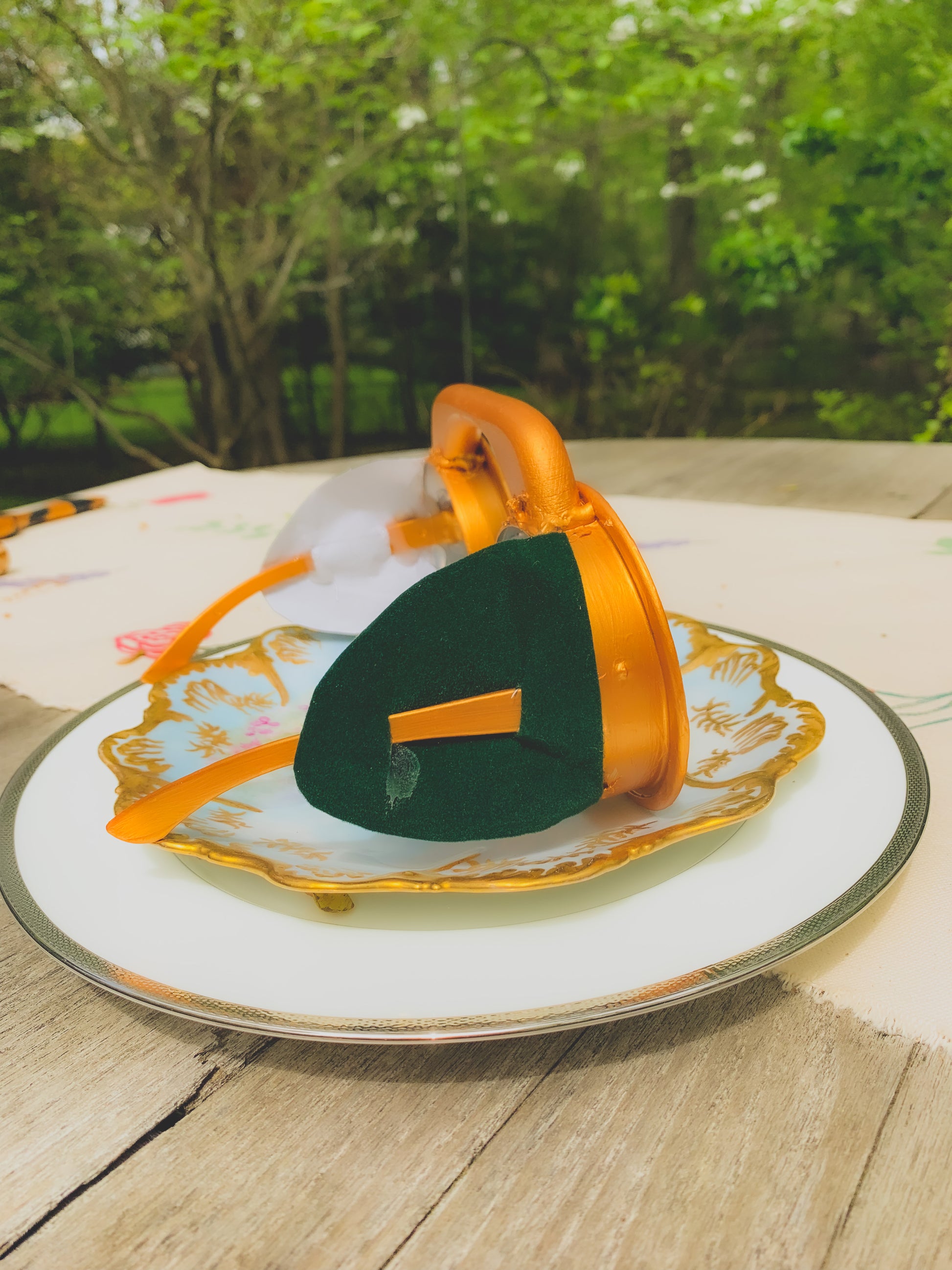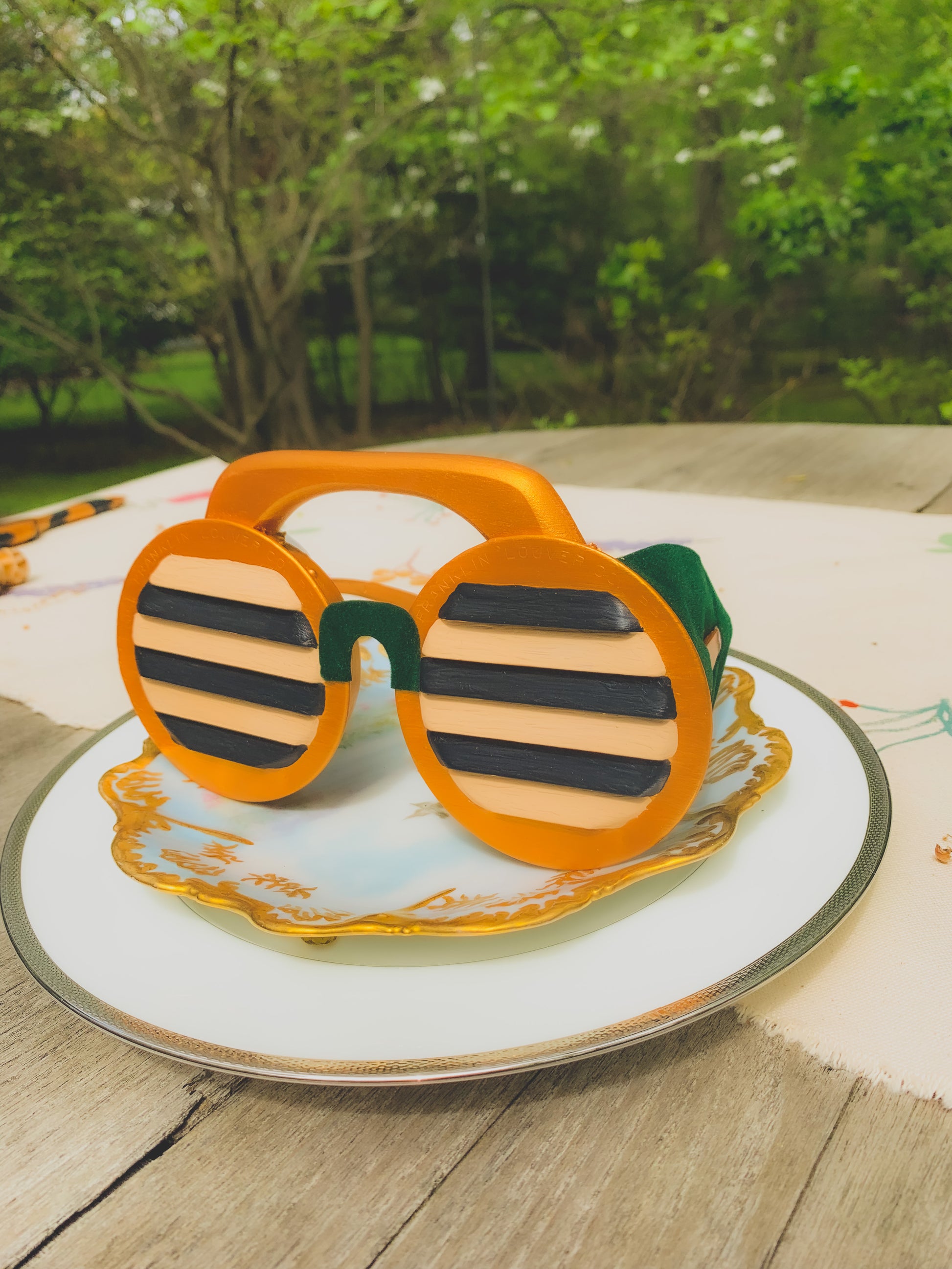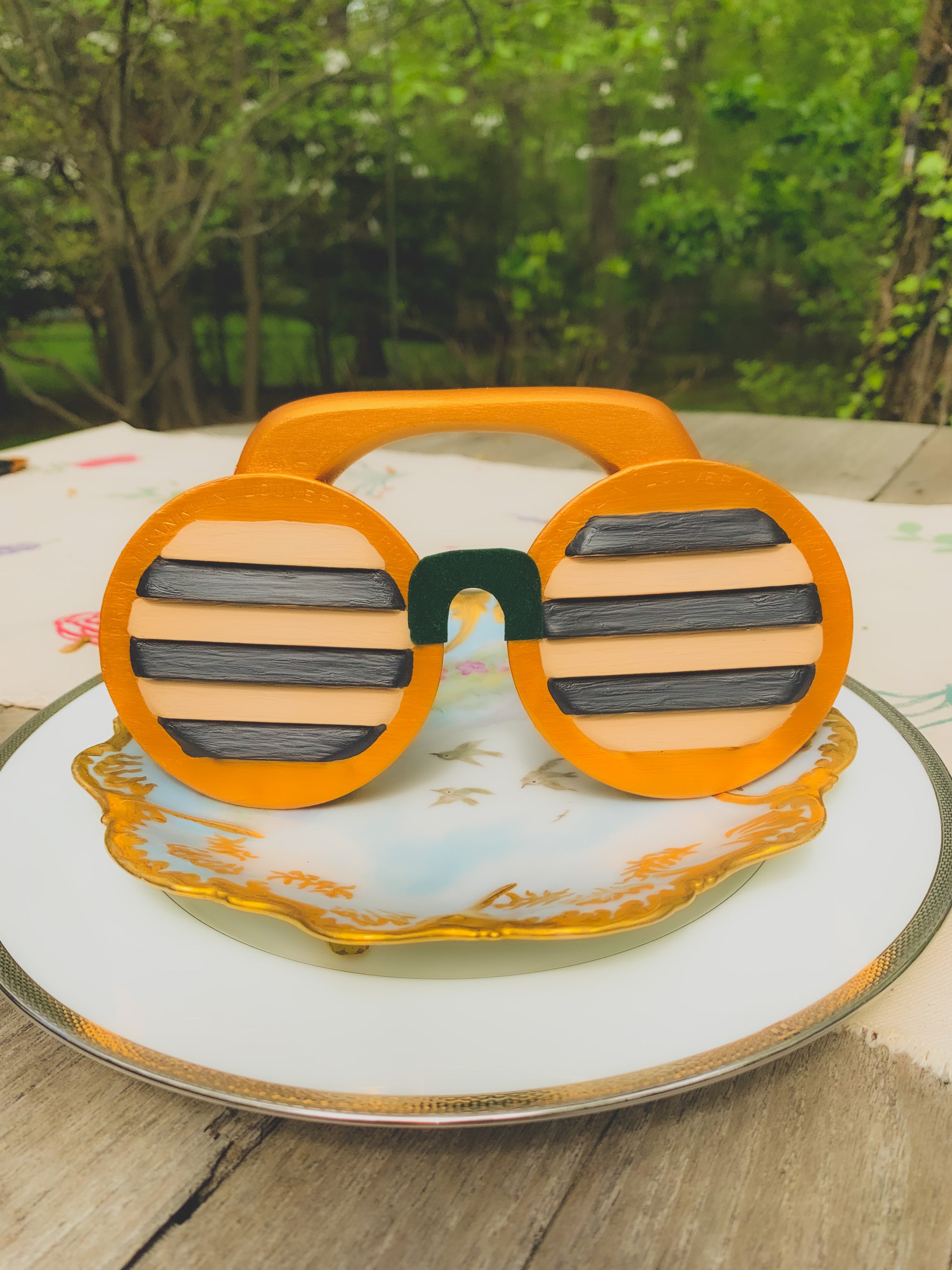 acrylic, house paint, hot glue and velvet felt on louvres, drawer pull and discarded sunglass parts
