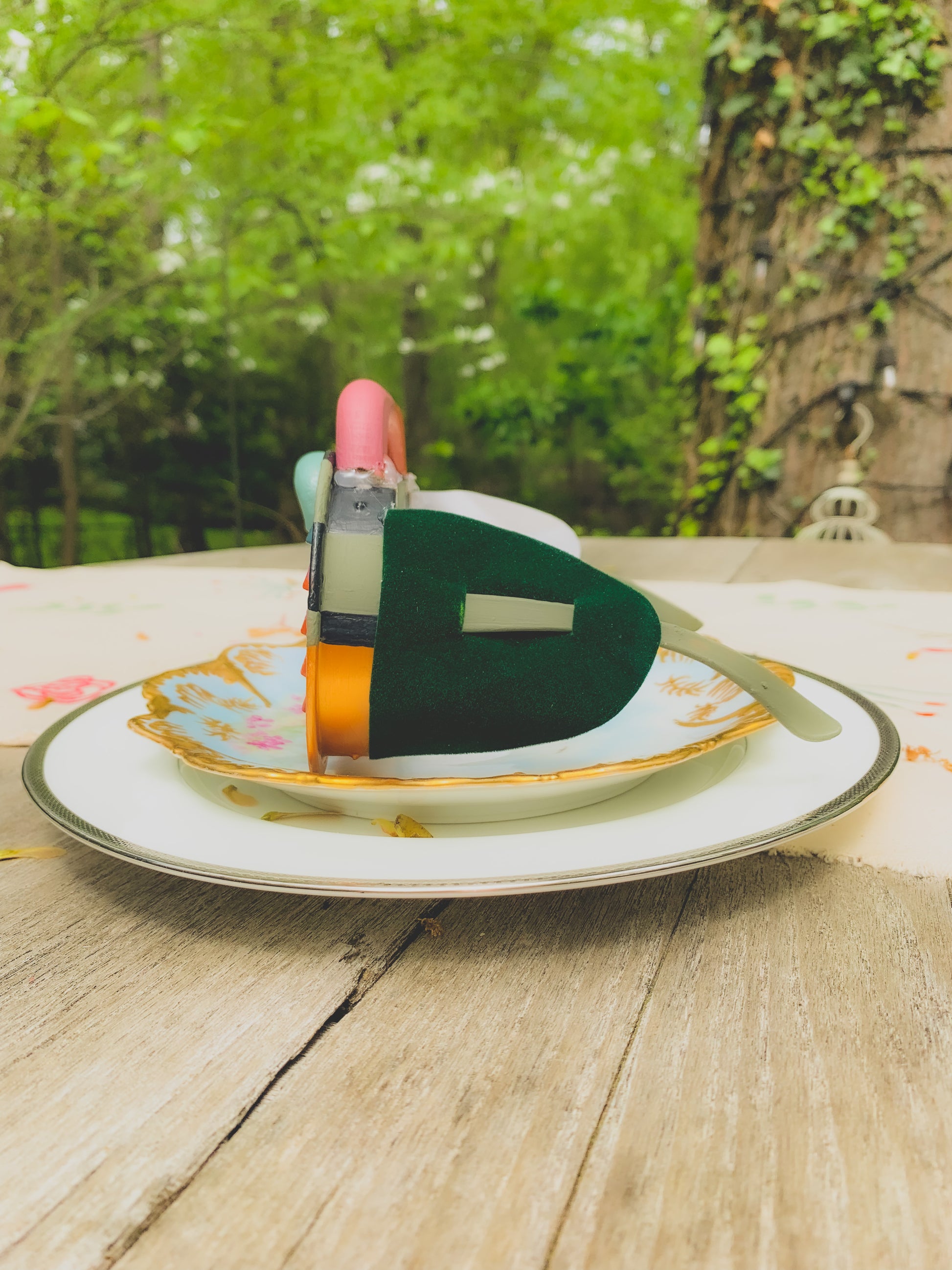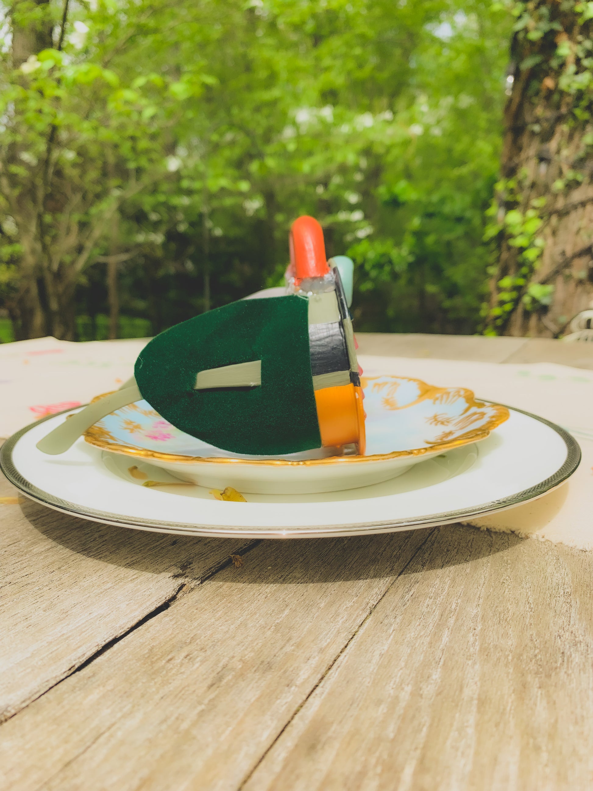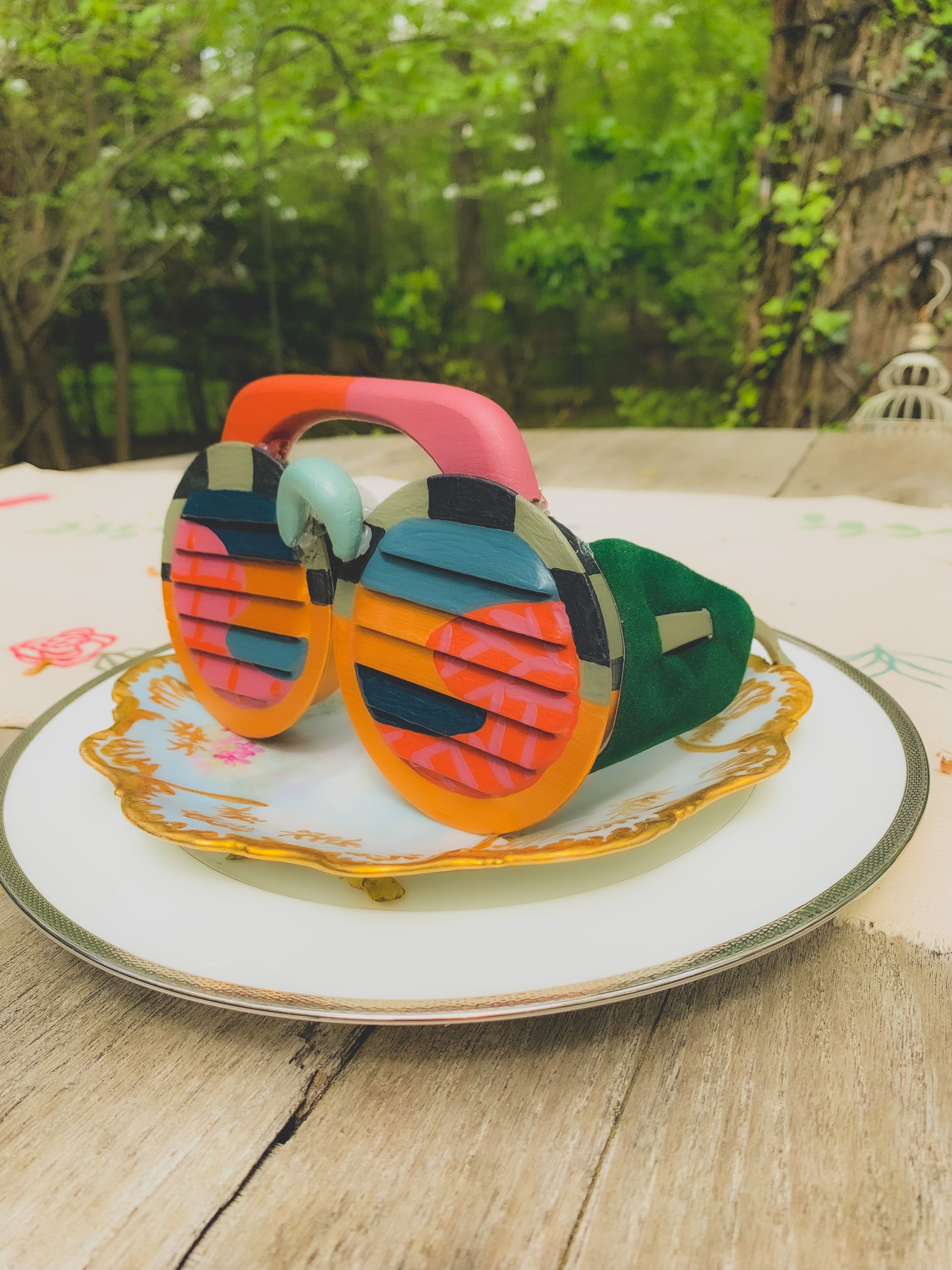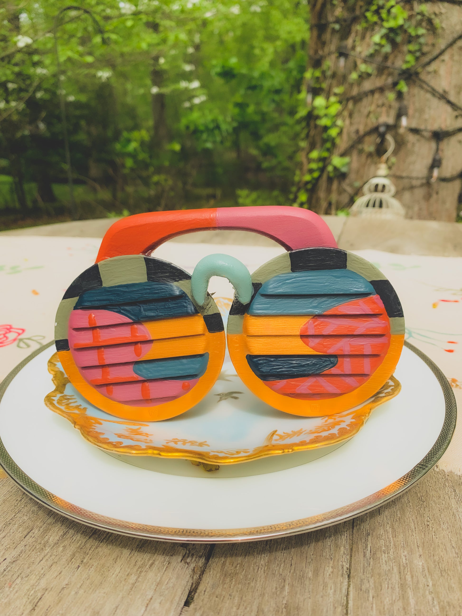 acrylic, house paint, hot glue, clay and velvet felt on louvres, drawer pull and discarded sunglass parts