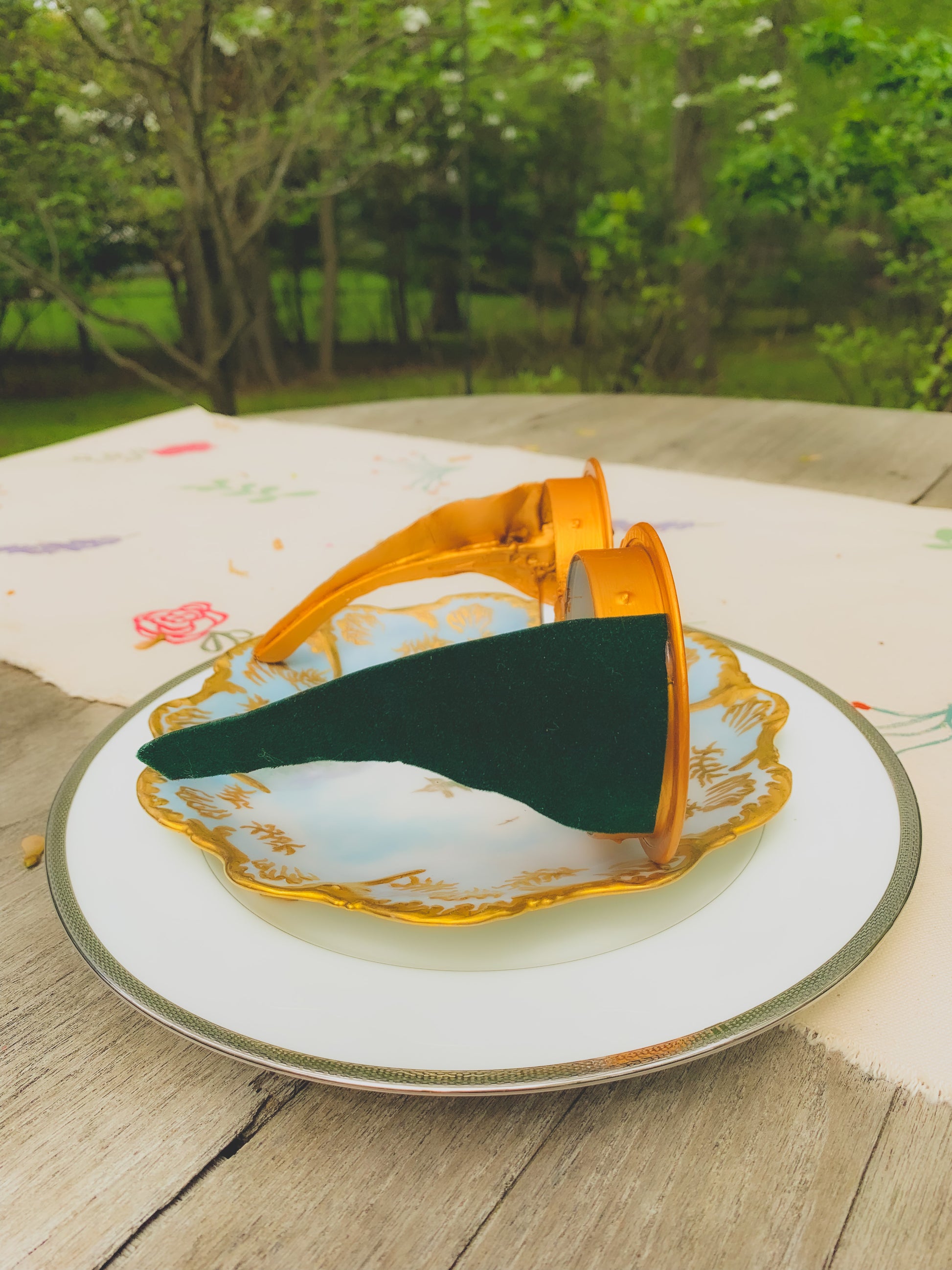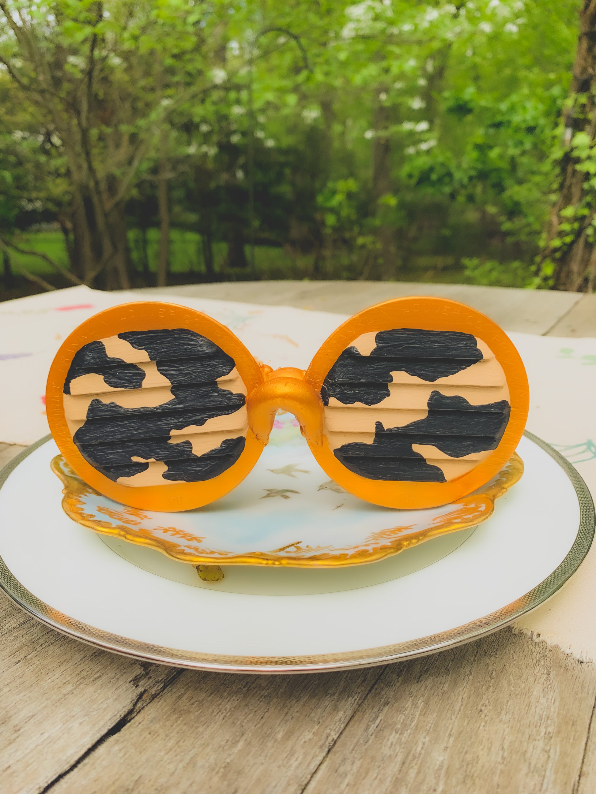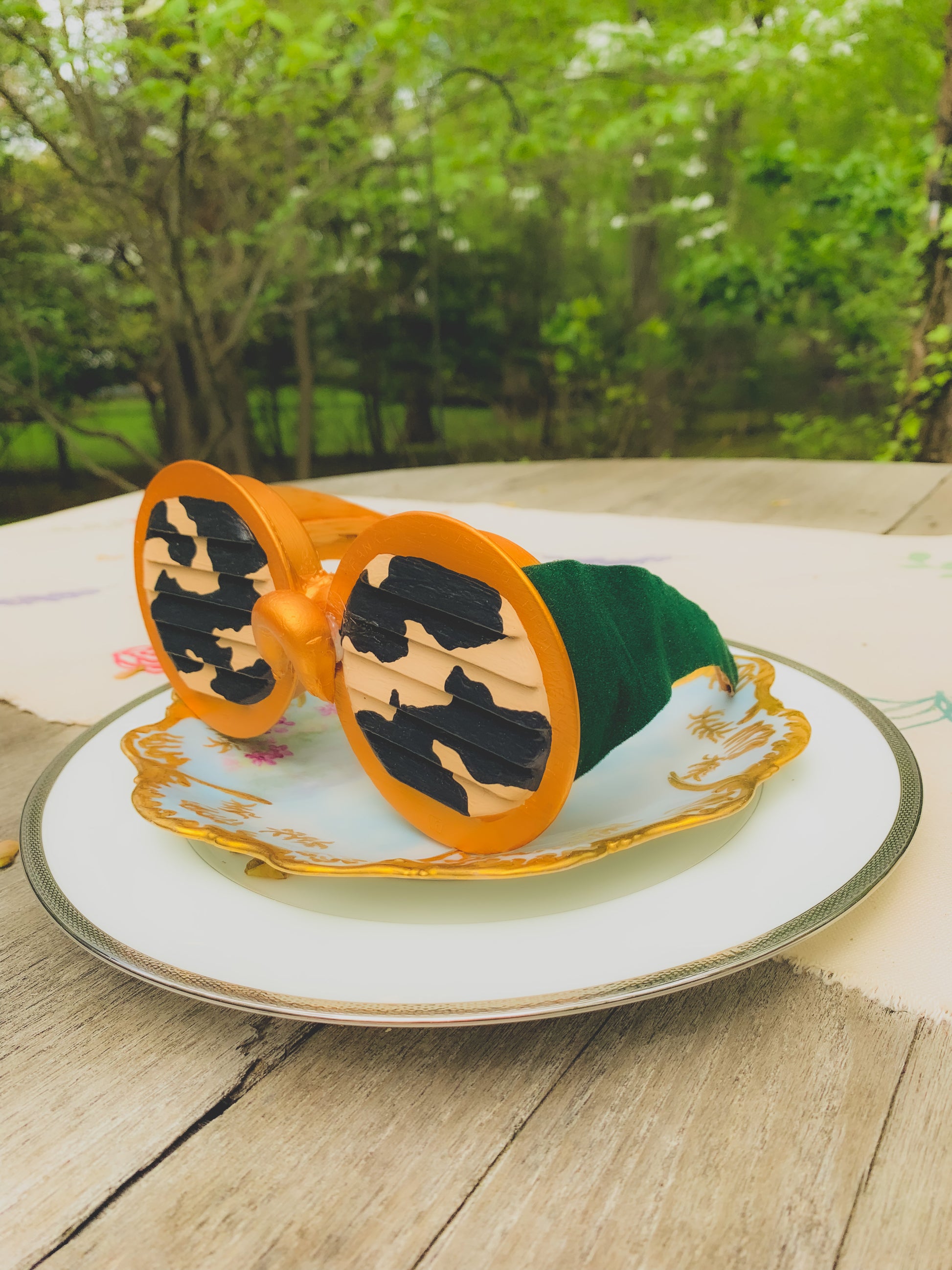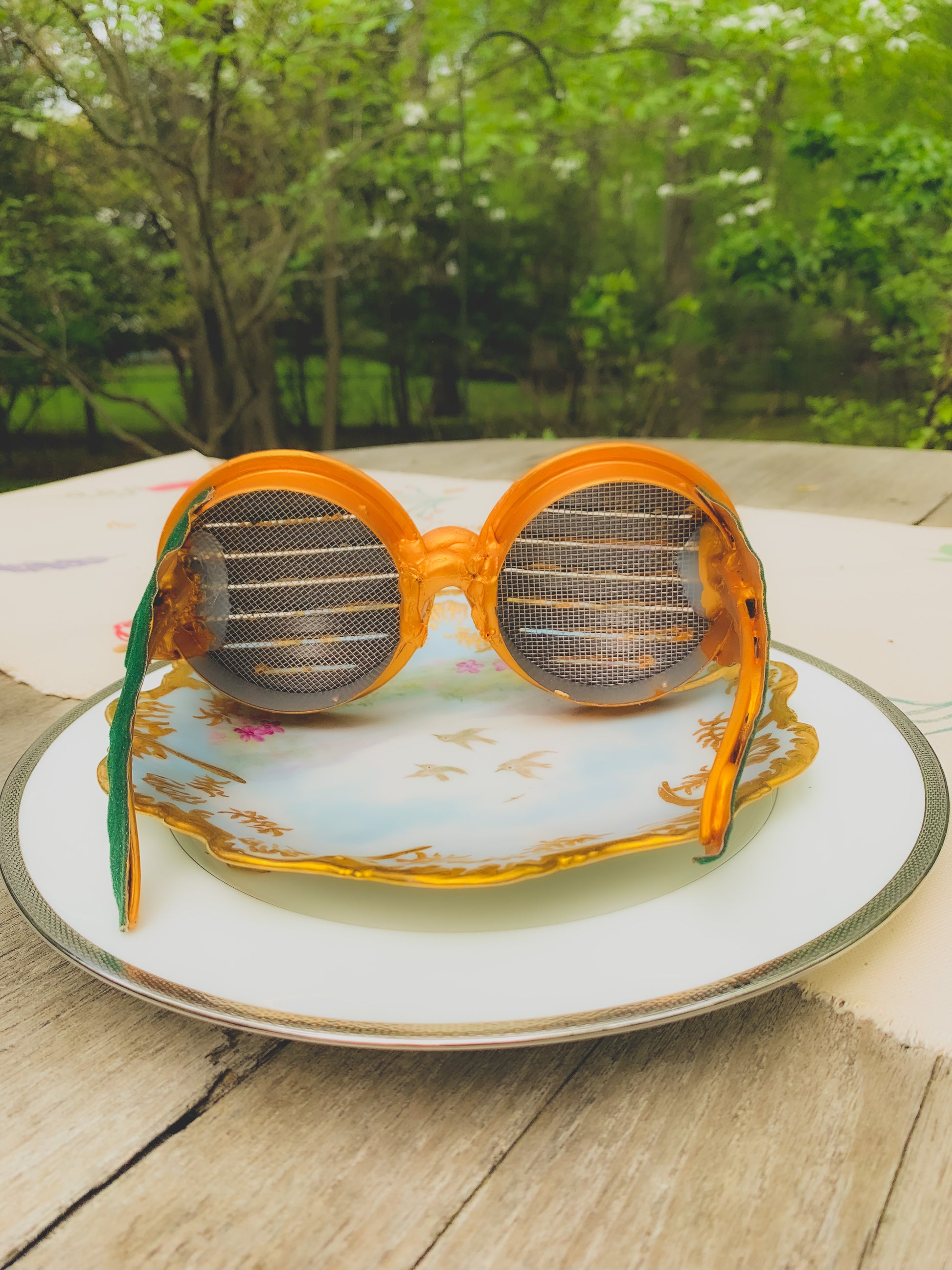 acrylic, house paint, hot glue, clay and velvet felt on louvres, drawer pull and discarded sunglass parts