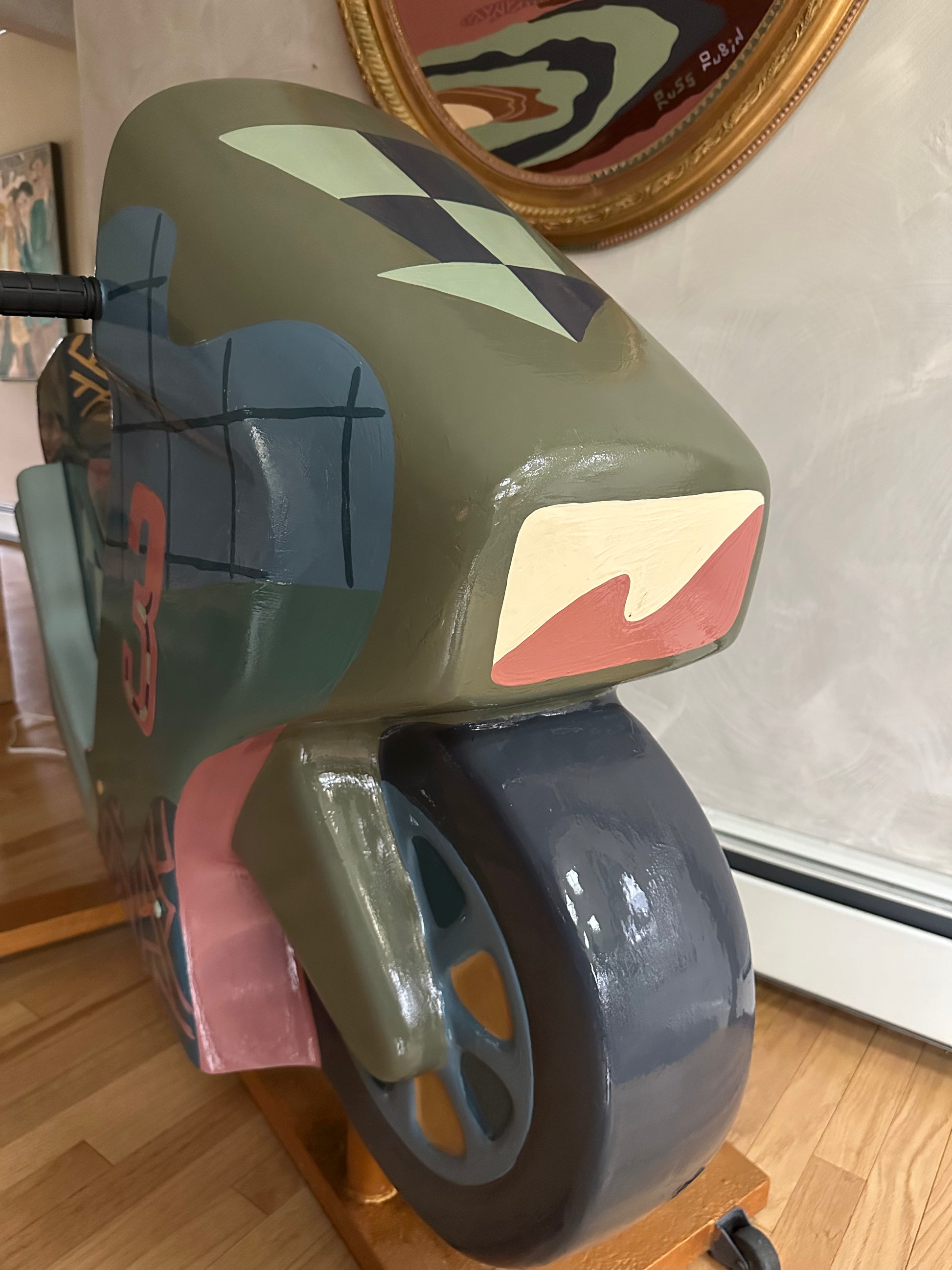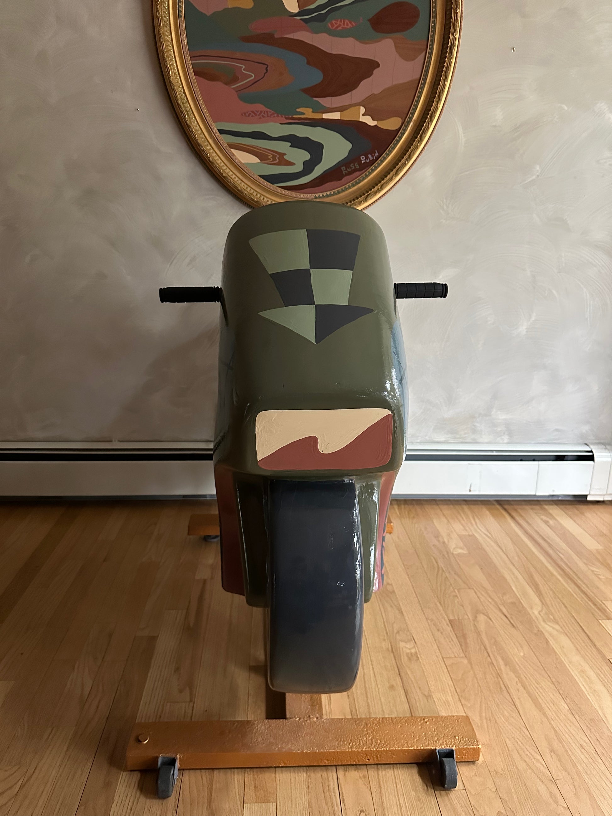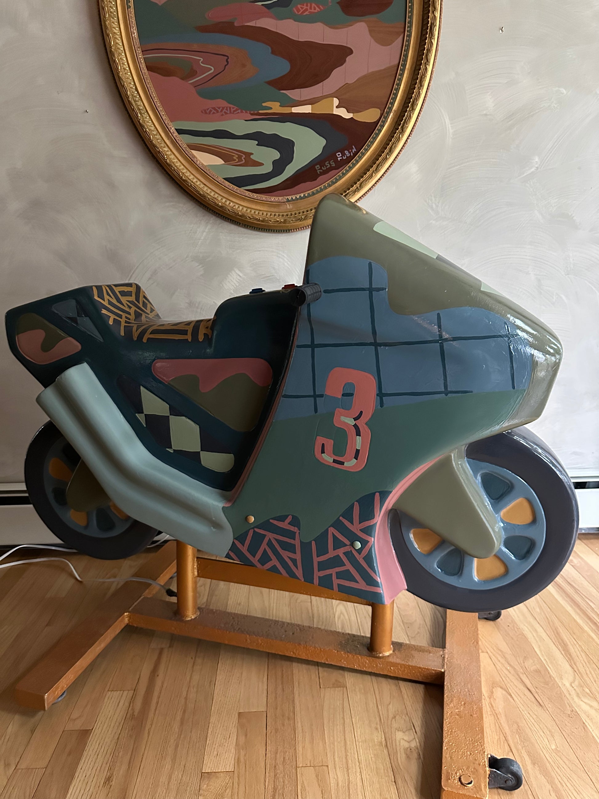 acrylic + house paint on working vintage motorcycle kiddie ride