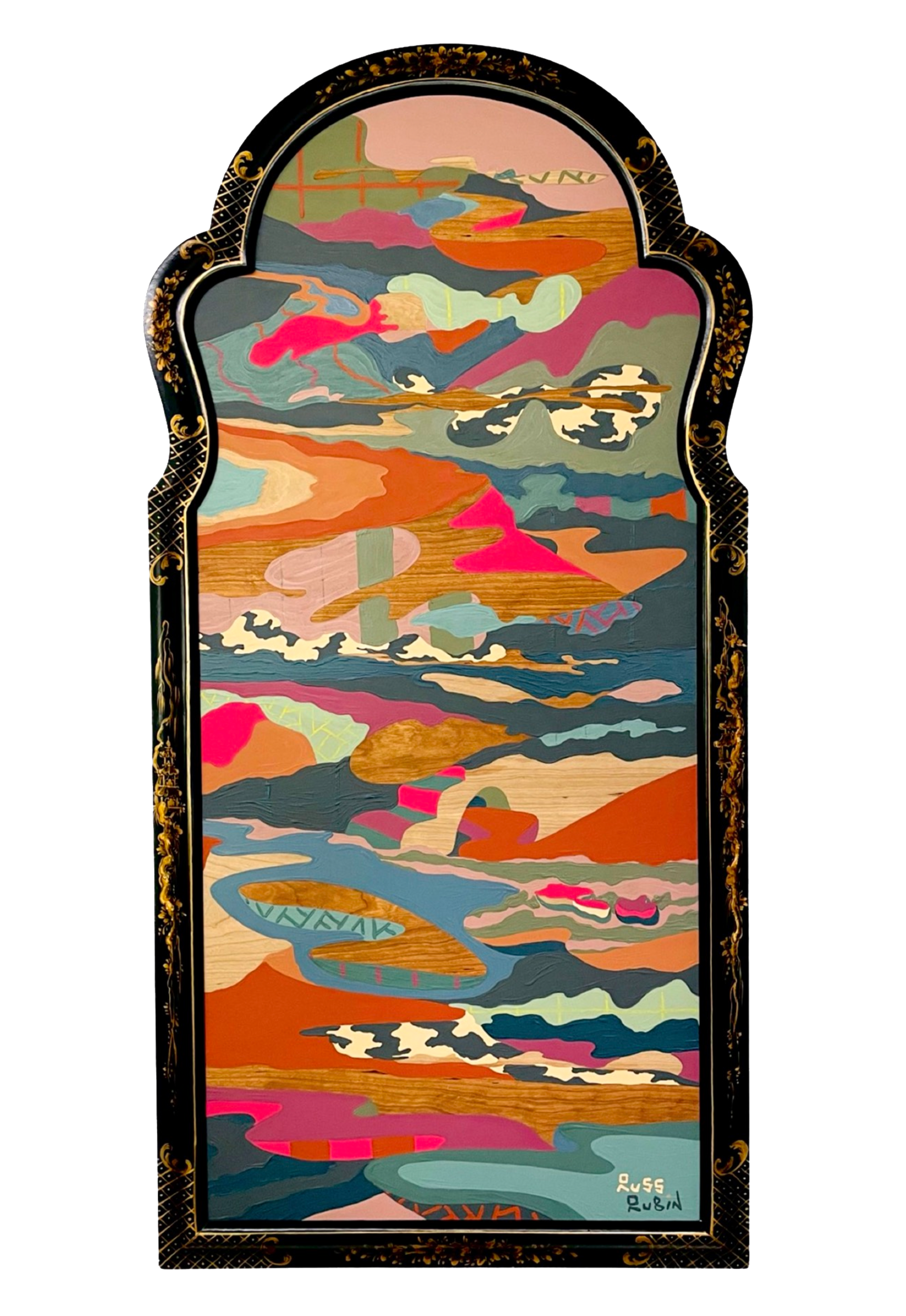 acrylic, house paint, pencil, colored pencil and wood oil on wood in vintage frame