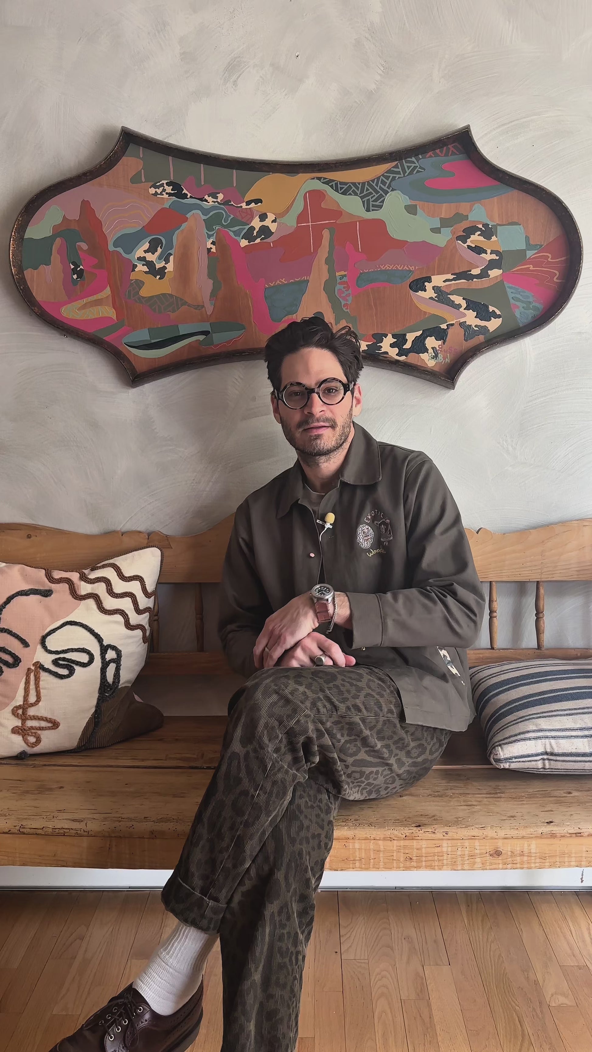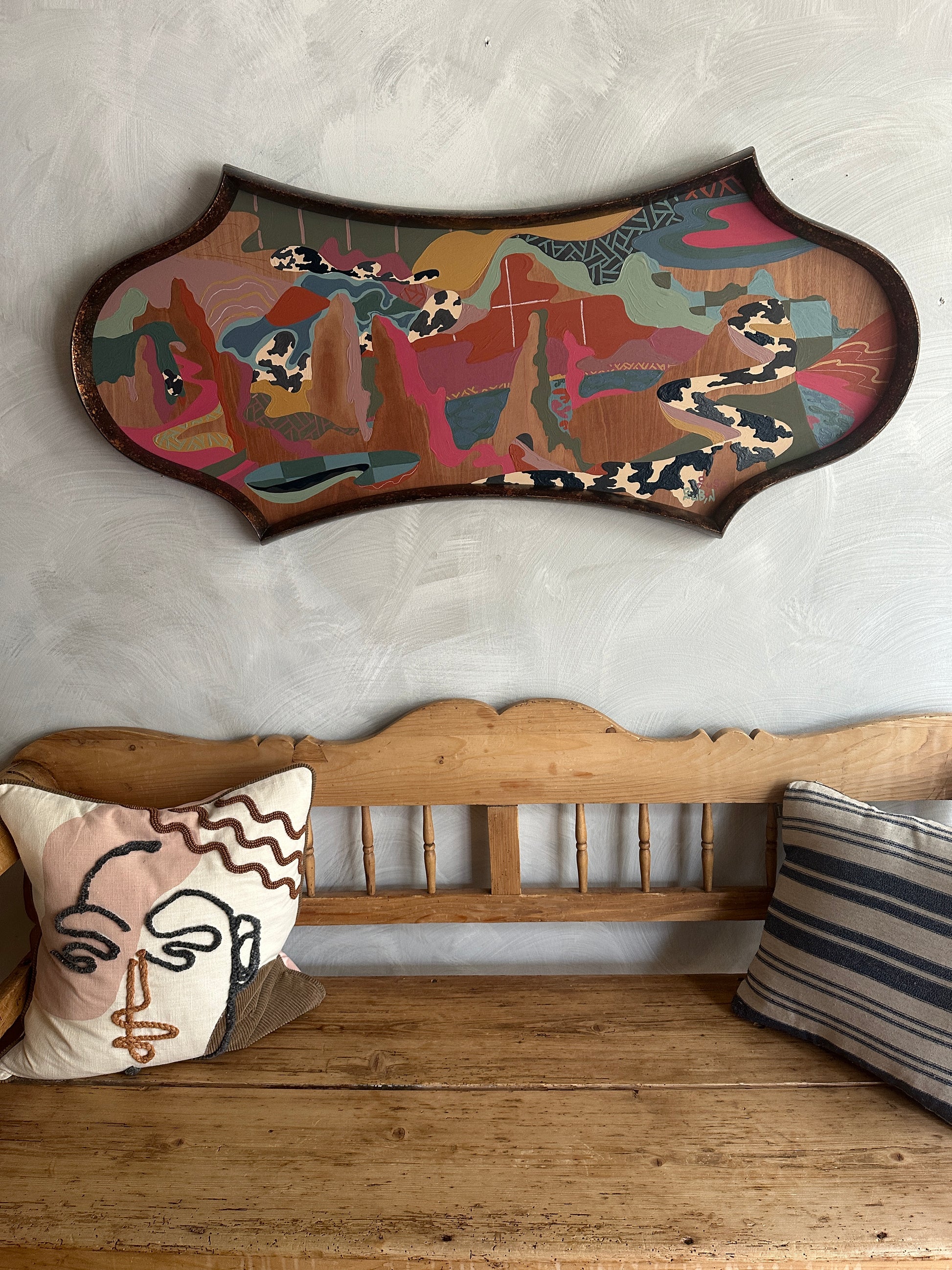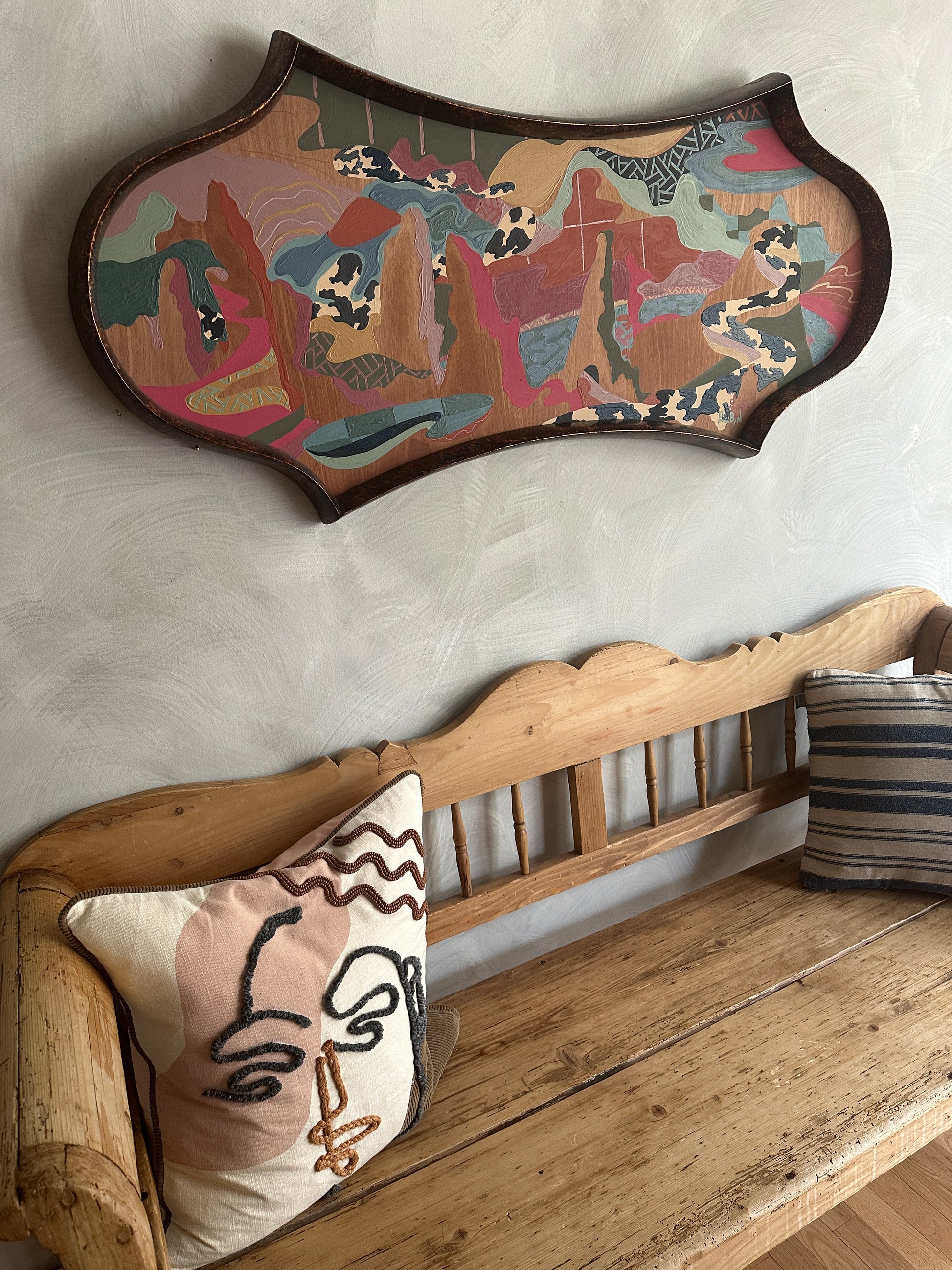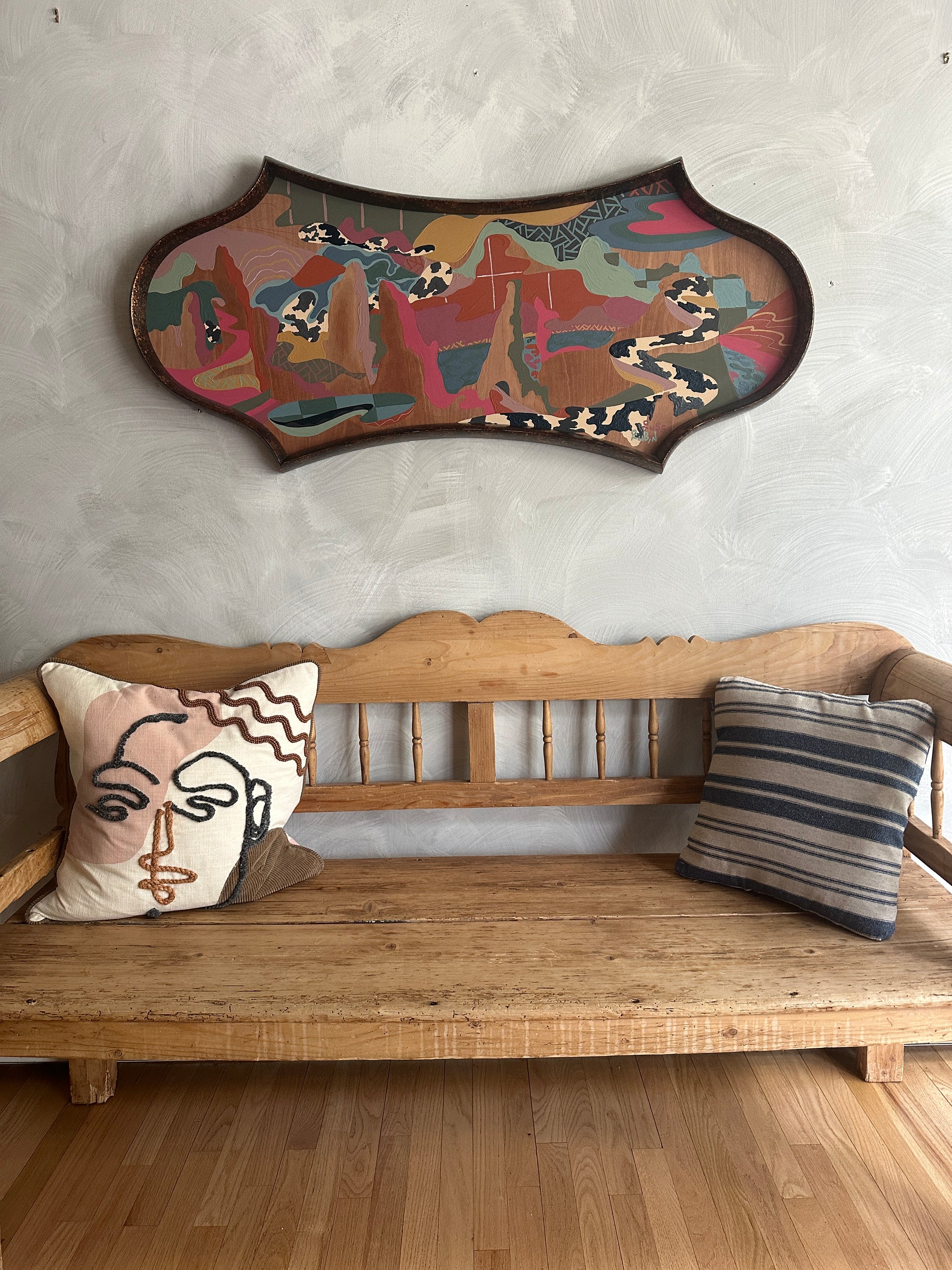 acrylic, house paint, colored pencil, and wood oil on wood in vintage frame