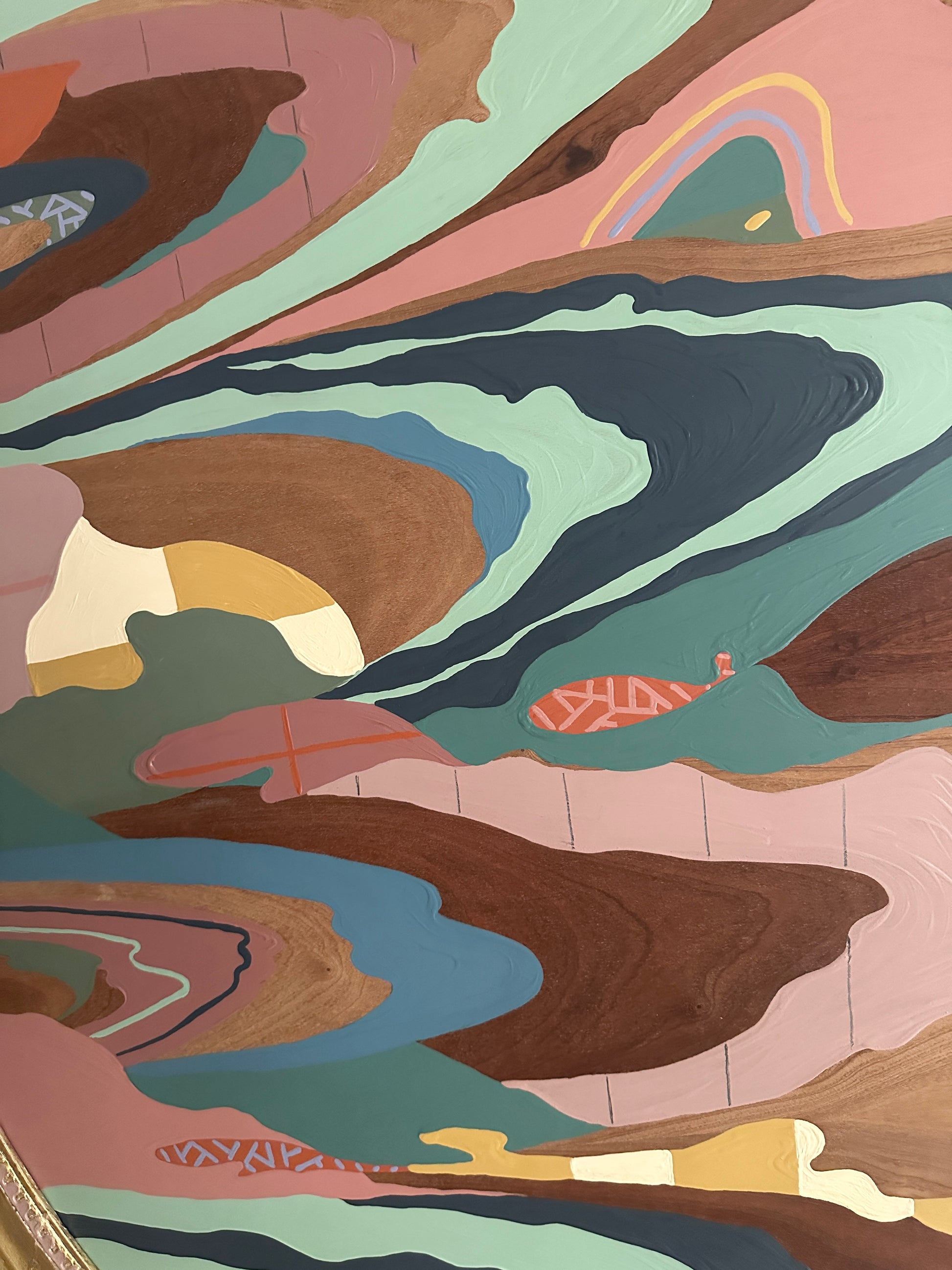 acrylic, house paint, pencil n wood oil on wood in embellished vintage frame