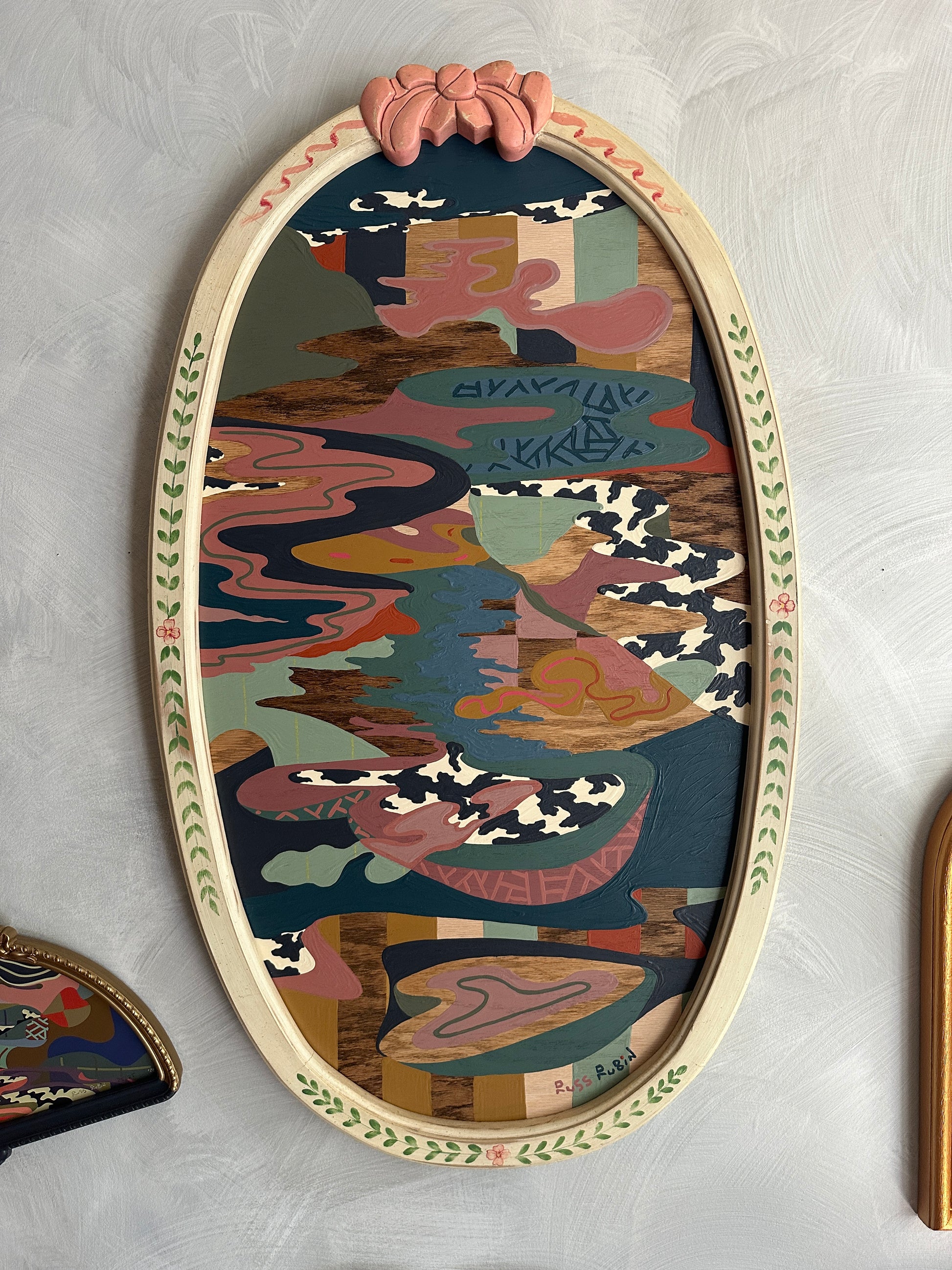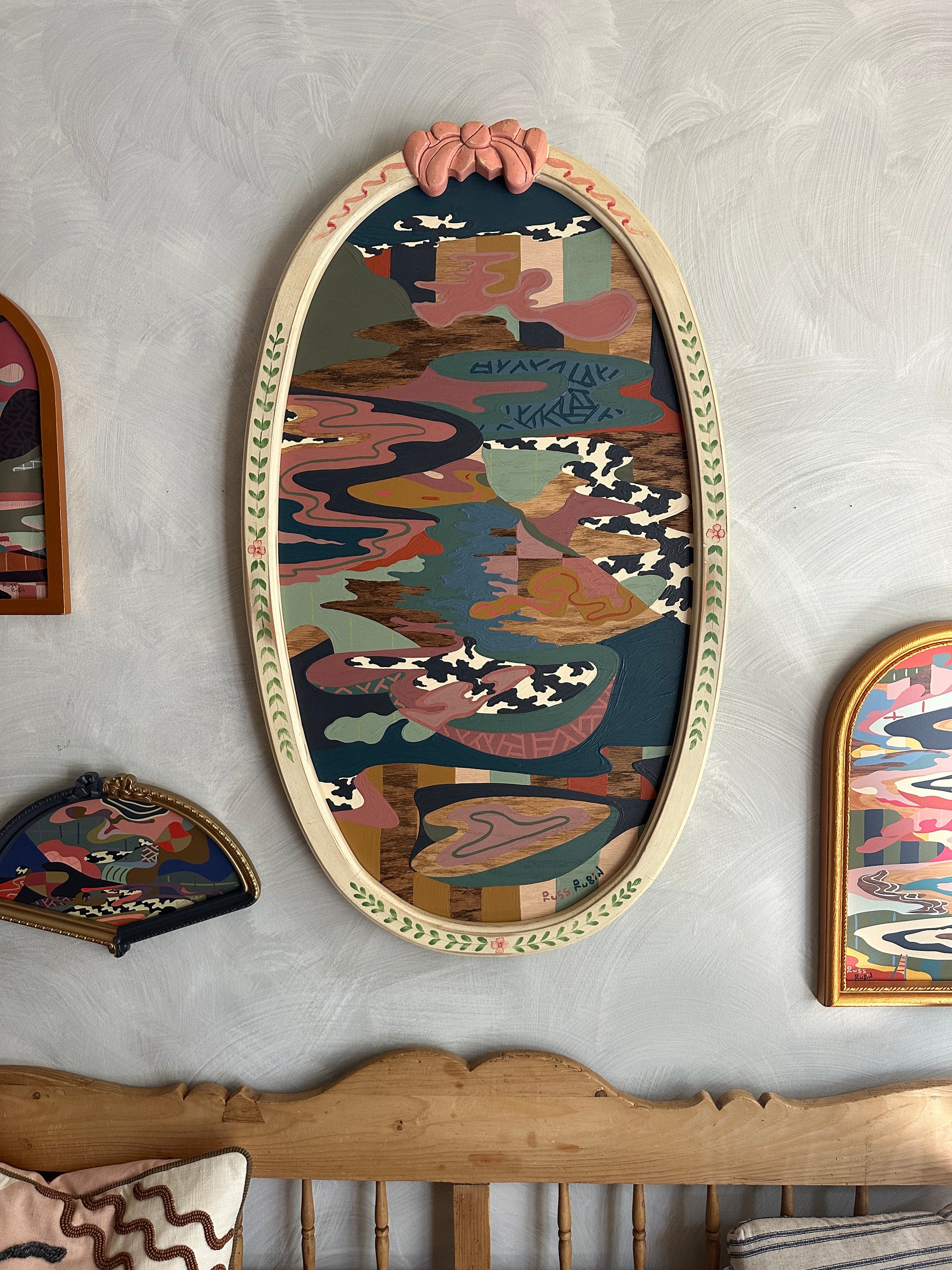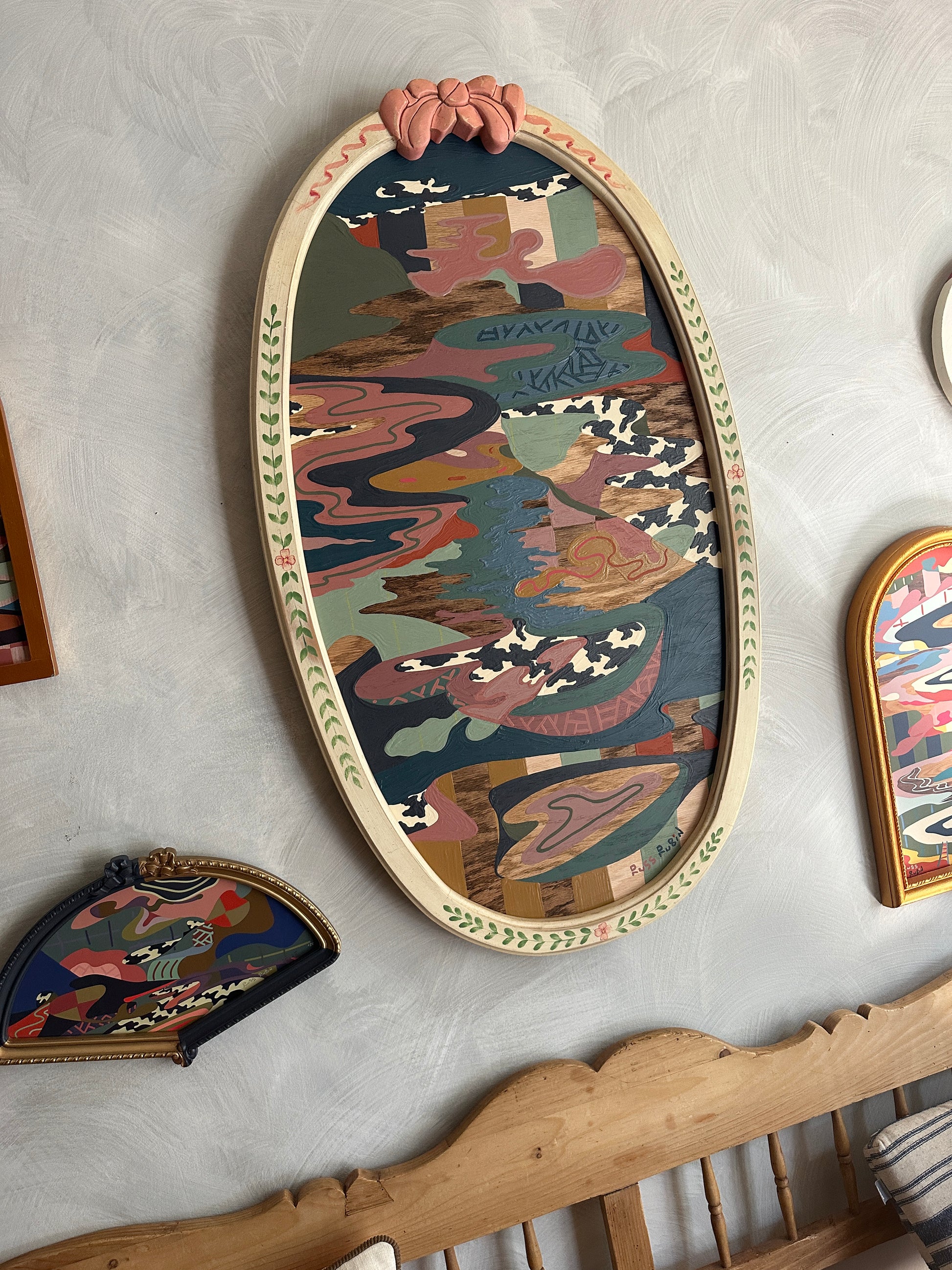 acrylic, house paint, colored pencil and wood oil on wood in vintage frame