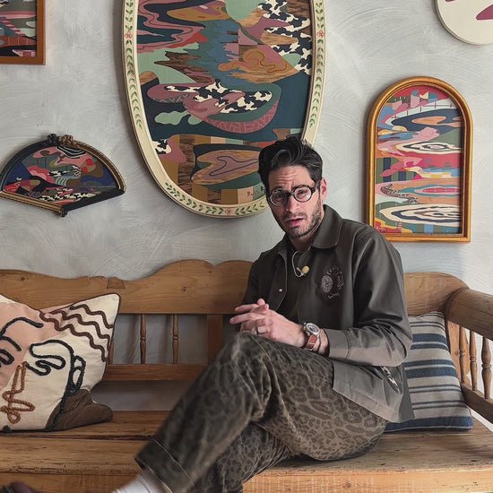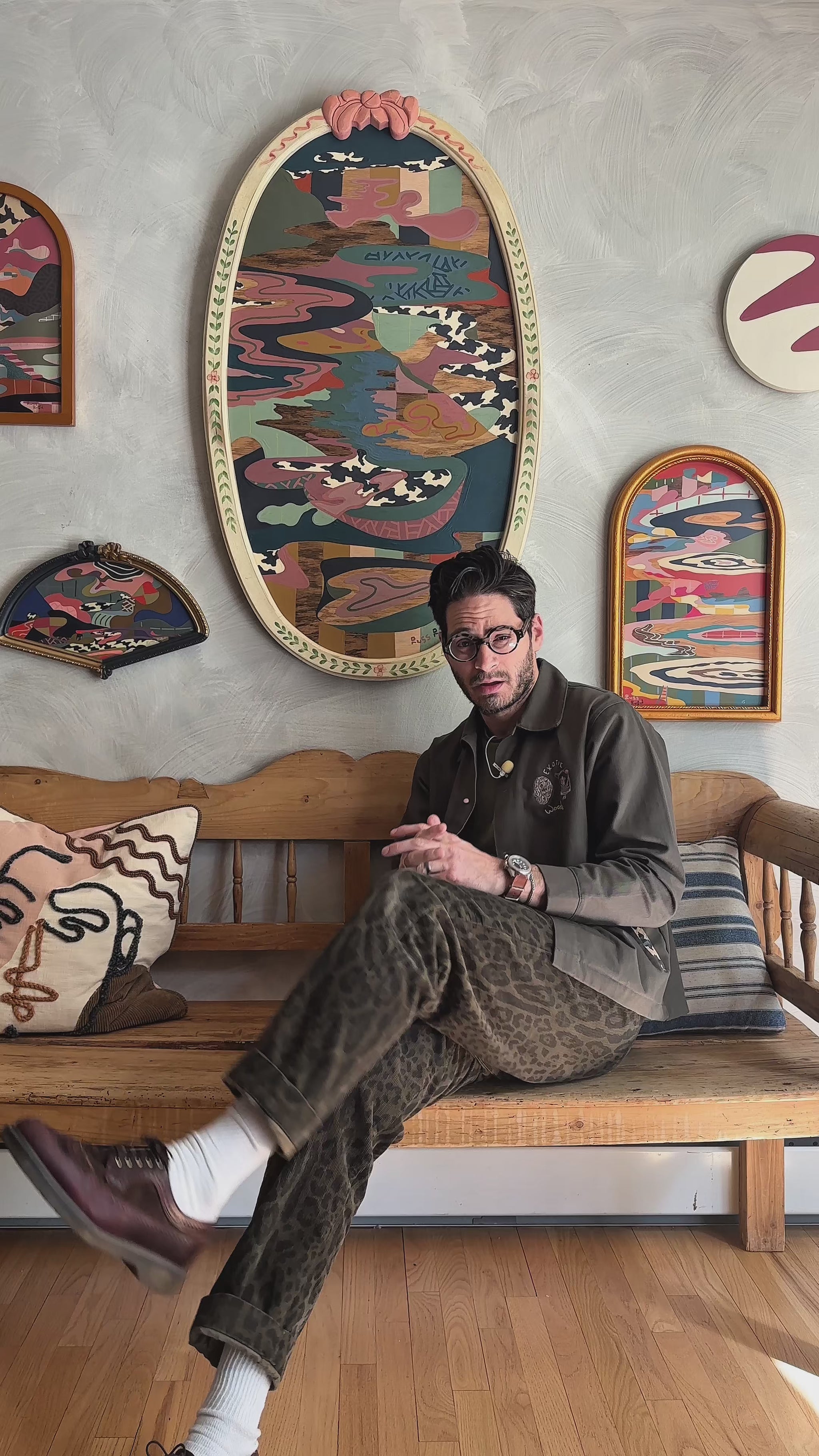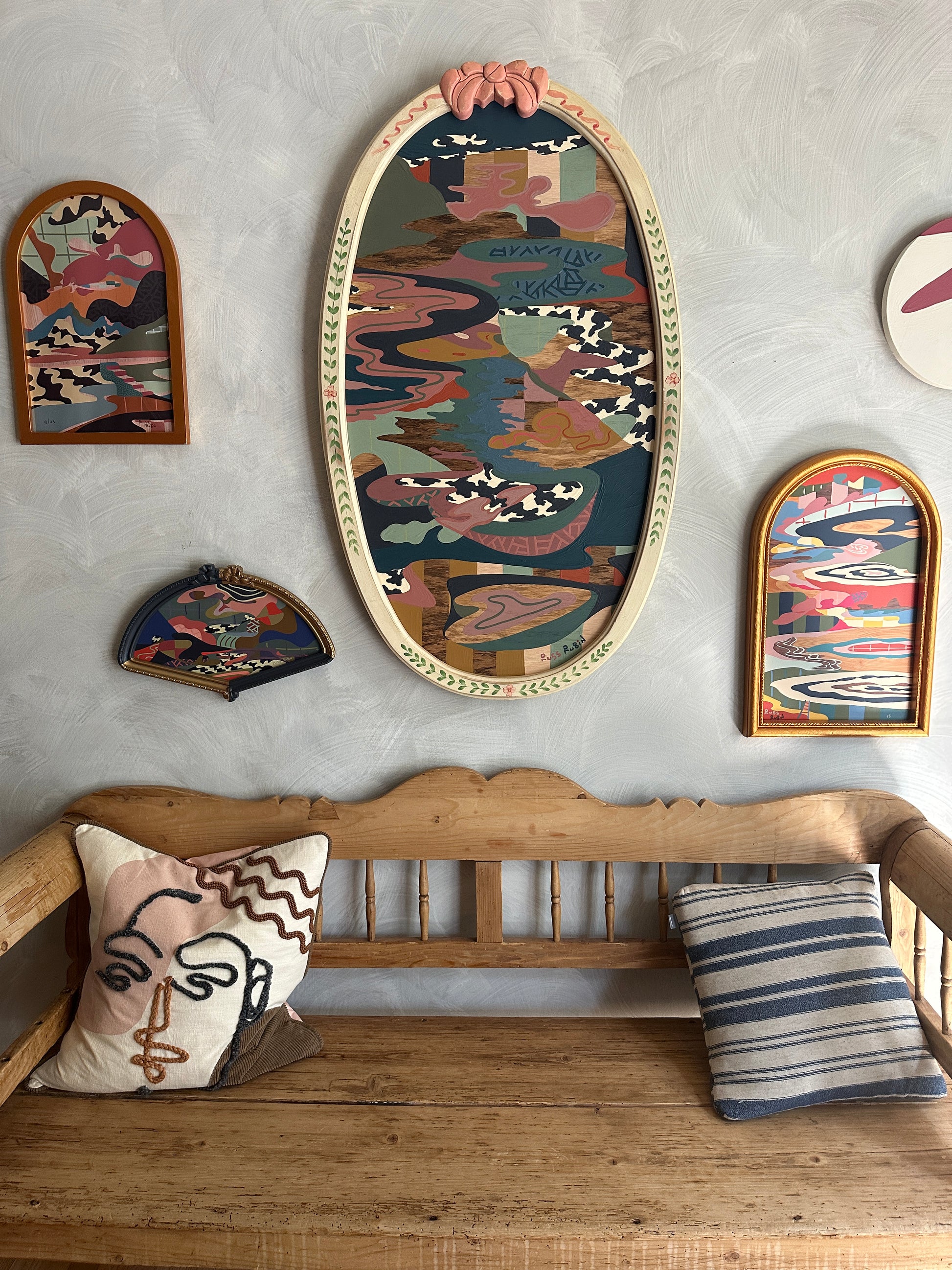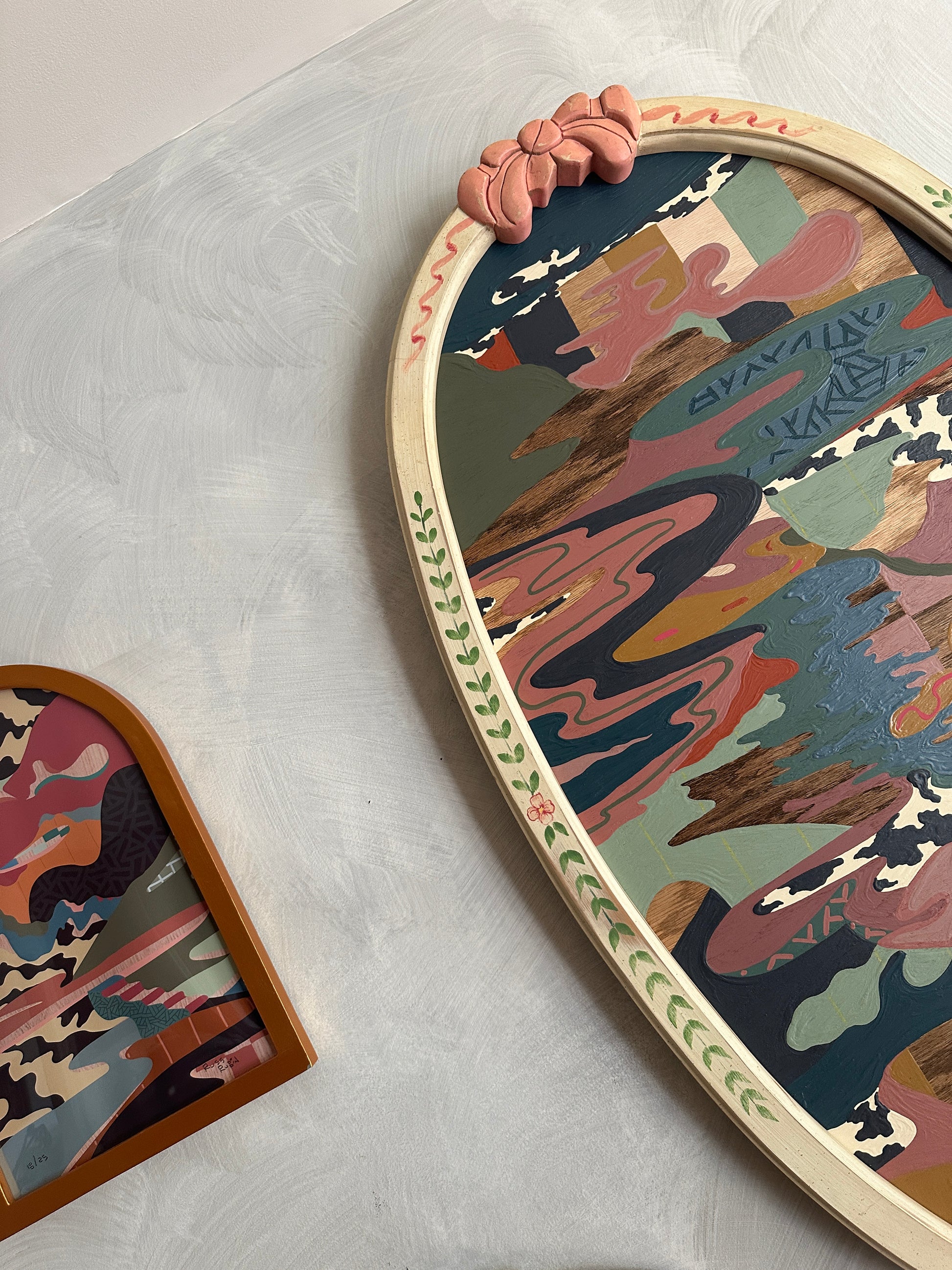 acrylic, house paint, colored pencil and wood oil on wood in vintage frame